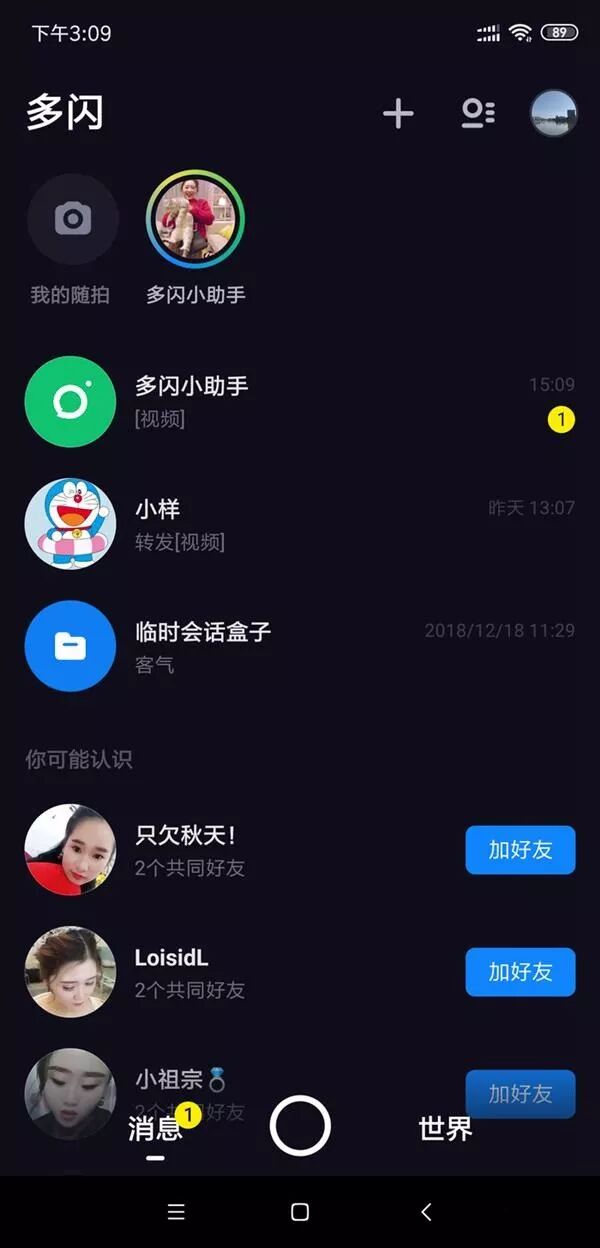 2、登录之后可以看到多闪APP主界面,目前功能比较简单,默认为好友列表,下方的功能栏则只要“消息”和“拍摄与世界”,两项功能。