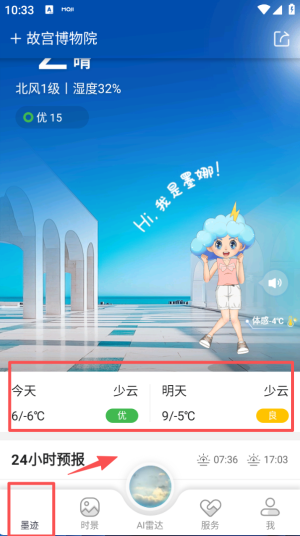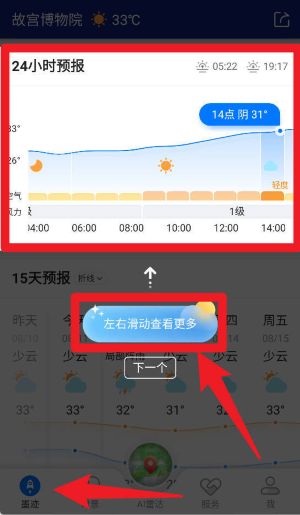 1、打开APP,在墨迹页面可查看未来24小时天气趋势与气温变化曲线,支持左右滑动查看更多时间段的天气情况,帮助用户合理安排出行。