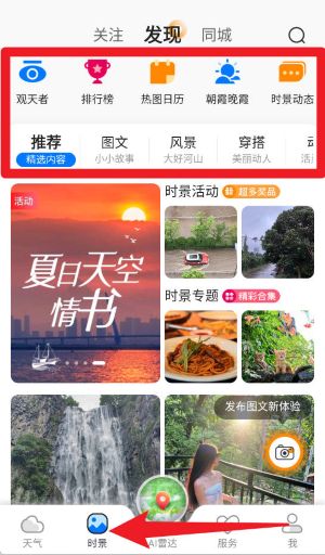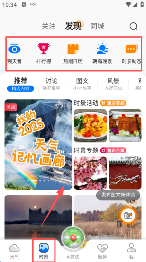 3、在“时景”板块可浏览精选推荐、图文故事、风景摄影及穿搭等多元化内容,还可参与时景活动或发布图文动态与其他用户互动。