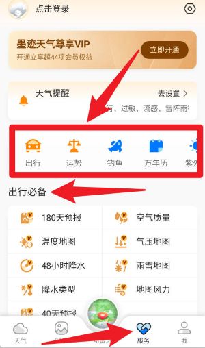 4、在“服务”页面可使用出行、运势、钓鱼、万年历、紫外线等实用工具,并查看180天预报、空气质量地图、降水与风力分布等专业数据。