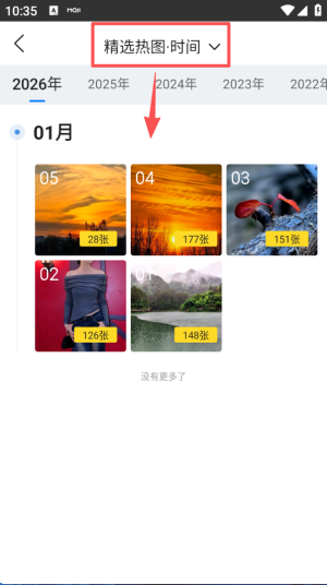 4、点击时景页的图文内容,可进入精选热图页面,顶部能选择年份与时间,查看对应日期的时景图片。