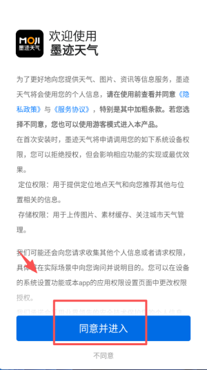 1、打开墨迹天气,首先显示隐私协议页面,点击 “同意并进入” 按钮,即可进入应用主界面。