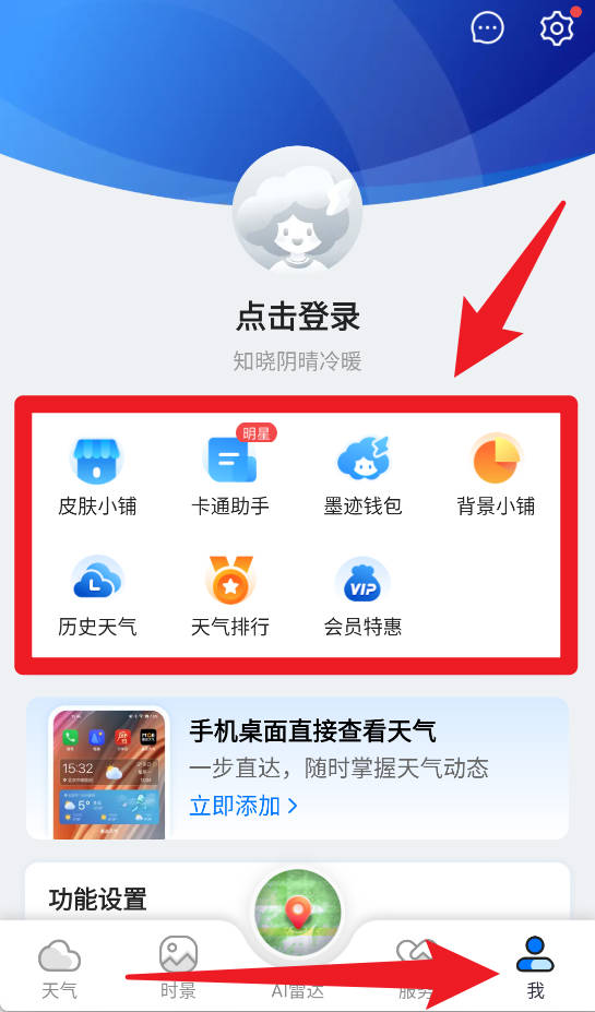 5、进入“我的”页面可管理皮肤小铺、卡通助手、墨迹钱包、背景小铺等个性化功能,还可查看历史天气、天气排行榜及会员专属特权。