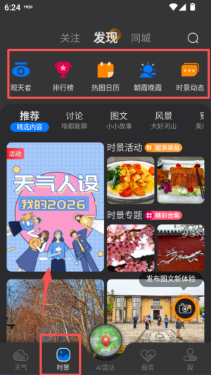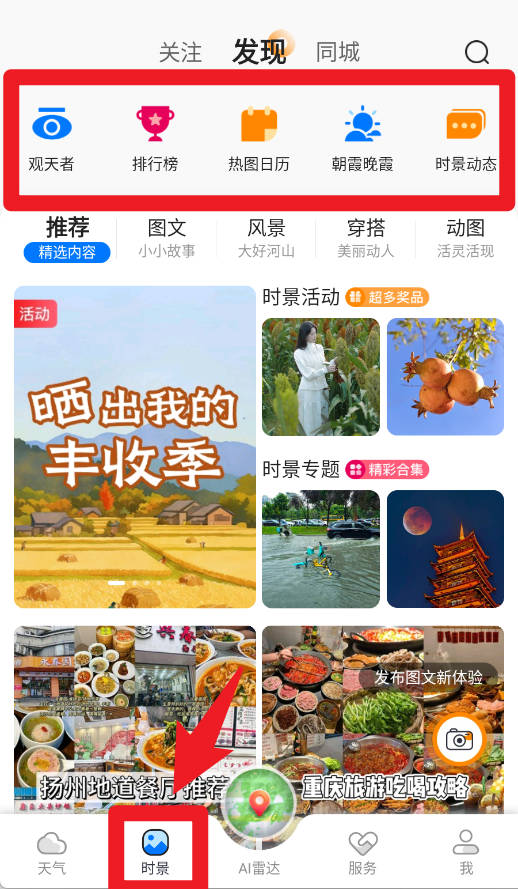 3、点击底部的时景入口,可以进入发现栏目,浏览排行、热图、朝霞晚霞等精选内容。