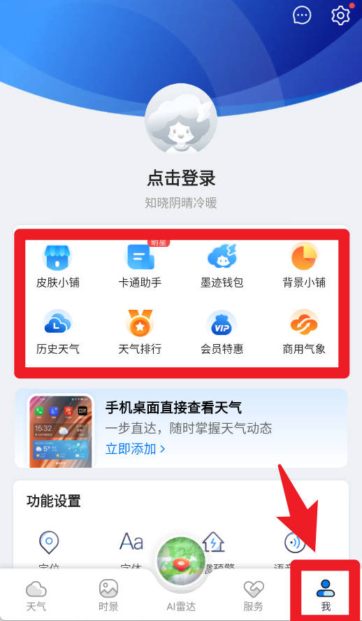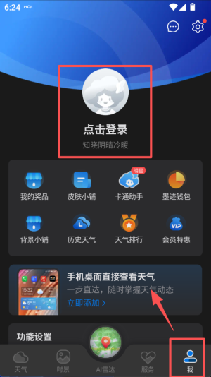 4、进入 “我” 的页面,顶部有登录提示,中间有我的奖品、皮肤小铺等功能,下方可添加手机桌面天气组件。