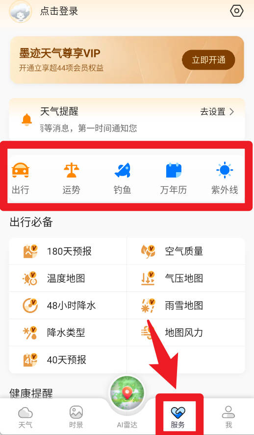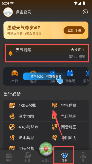 3、打开 “服务” 页面,顶部有时效天气 VIP 提示,中间有天气提醒设置入口,下方列出 180 天预报等出行工具。