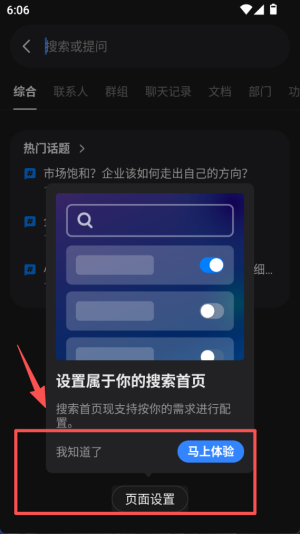 4、进入搜索页面,顶部是搜索栏,中间有热门话题展示,下方提示可设置搜索首页,配有 “我知道了” 等操作按