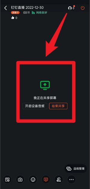 5、在直播过程中,点击“共享屏幕”即可展示实时画面,同时可开启设备音频或点击“结束共享”结束直播。