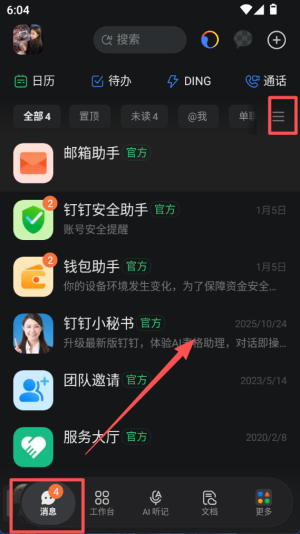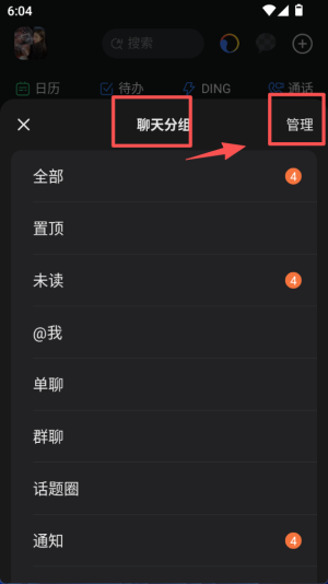 3、点击消息页面的菜单按钮,进入聊天分组管理界面,可看到全部、置顶等消息分类,右侧有 “管理” 按钮。