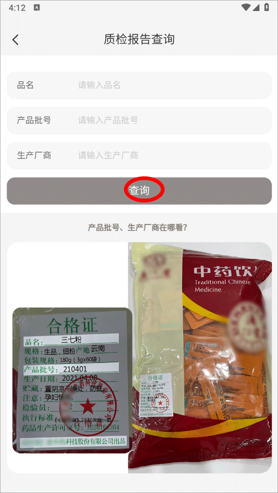 3、输入商品名称、批号、生产厂家点击查询即可查看质检报告