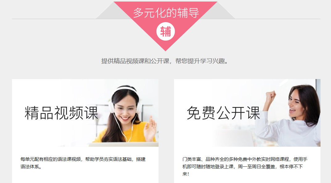 2、中教课程:面向零基础学员的起步课程,中教老师使用中英双语,引领要基础学员走向外教1对1。