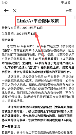 2、点击页面中的系统用户隐私协议链接,查看 /A + 平台隐私政策的发布日期及具体条款内容。
