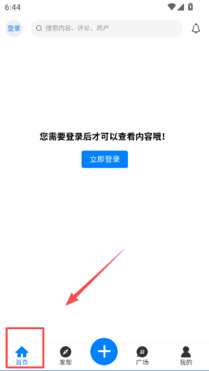 1、进入应用首页,看到需登录查看内容的提示后,点击底部我的选项,再点击界面中的立即登录按钮。