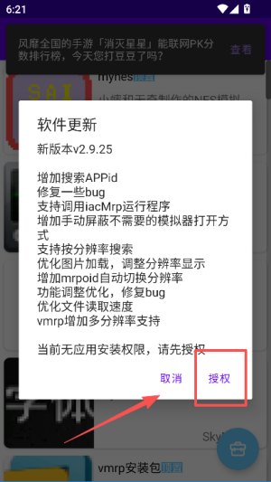 1、在Mrp商店弹出的软件更新提示框中,看到当前无安装权限的提示后,点击授权按钮来获取权限。