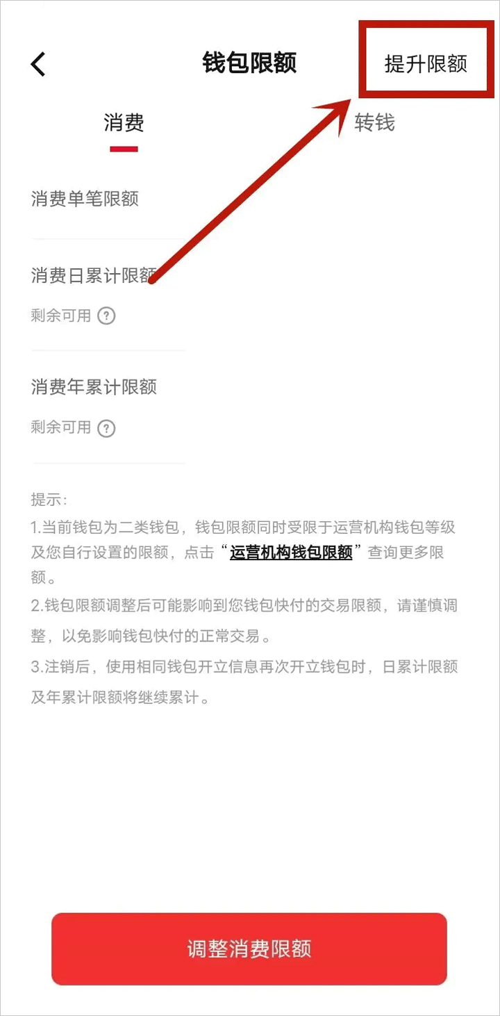 3、支付限额页面,点击右上角提升限额,解冻钱包止付。