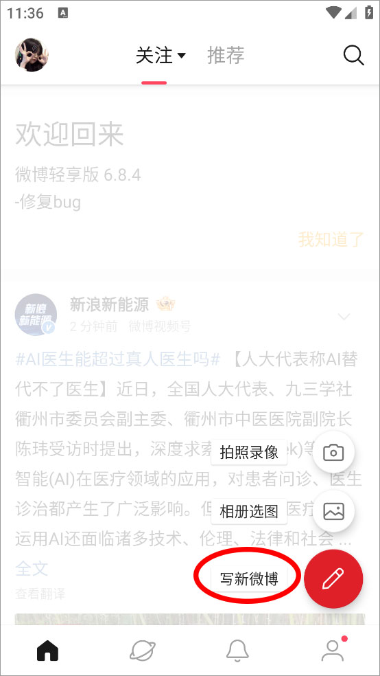 微博轻享版app怎么发微博