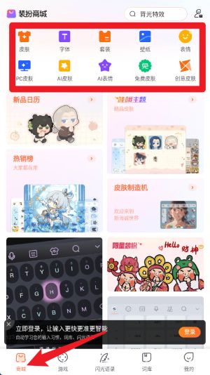 1、打开APP,在“商城”页面可选择皮肤、字体、套装、壁纸、表情等分类,点击进入可下载或购买所需资源。