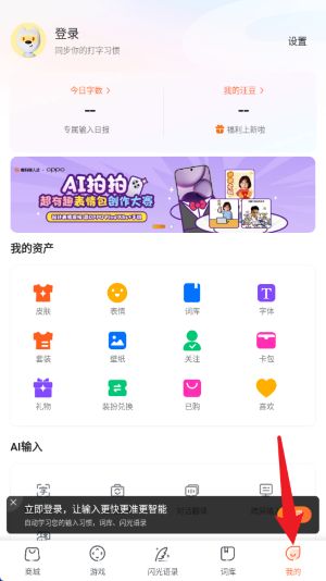 5、在“我的”页面可查看并管理皮肤、表情、词库、字体等个人资产,设置输入习惯与账号信息。