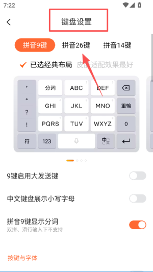 3、进入键盘设置页面,选择拼音 9 键等布局,调整按键相关的功能选项。