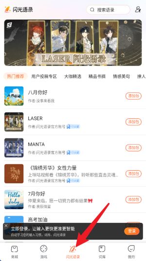 3、在“闪光语录”页面可查看热门推荐及分类语录,点击“添加包”即可将语录加入输入法使用。