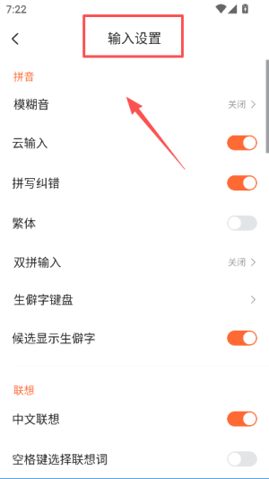 1、进入输入设置页面,可调整云输入、拼写纠错等功能的开关状态,适配输入习惯。