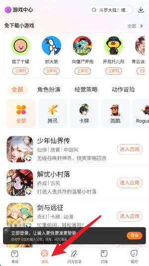 2、在“游戏”页面可浏览并试玩各类小游戏,按分类筛选并点击“进入应用”即可开始游戏。