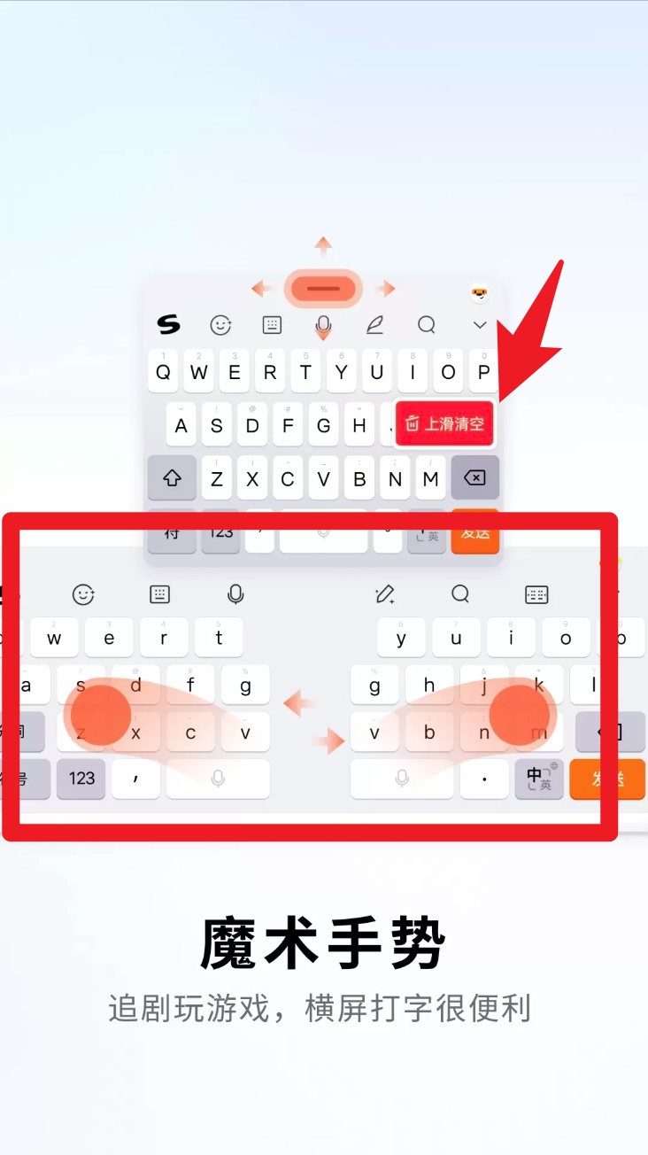 3. 向上滑动或双指外扩手势,可开启横屏键盘模式,追剧或玩手游时打字更加方便高效。