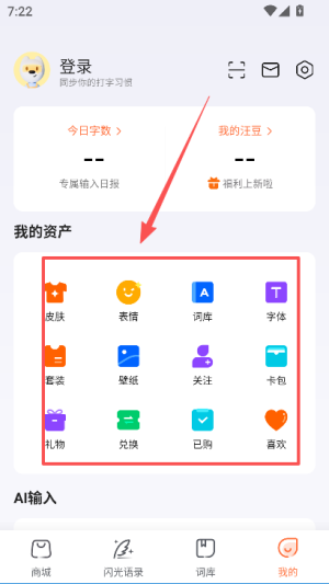 2、进入我的页面,查看资产板块中的词库等内容,确认已添加的词库状态。