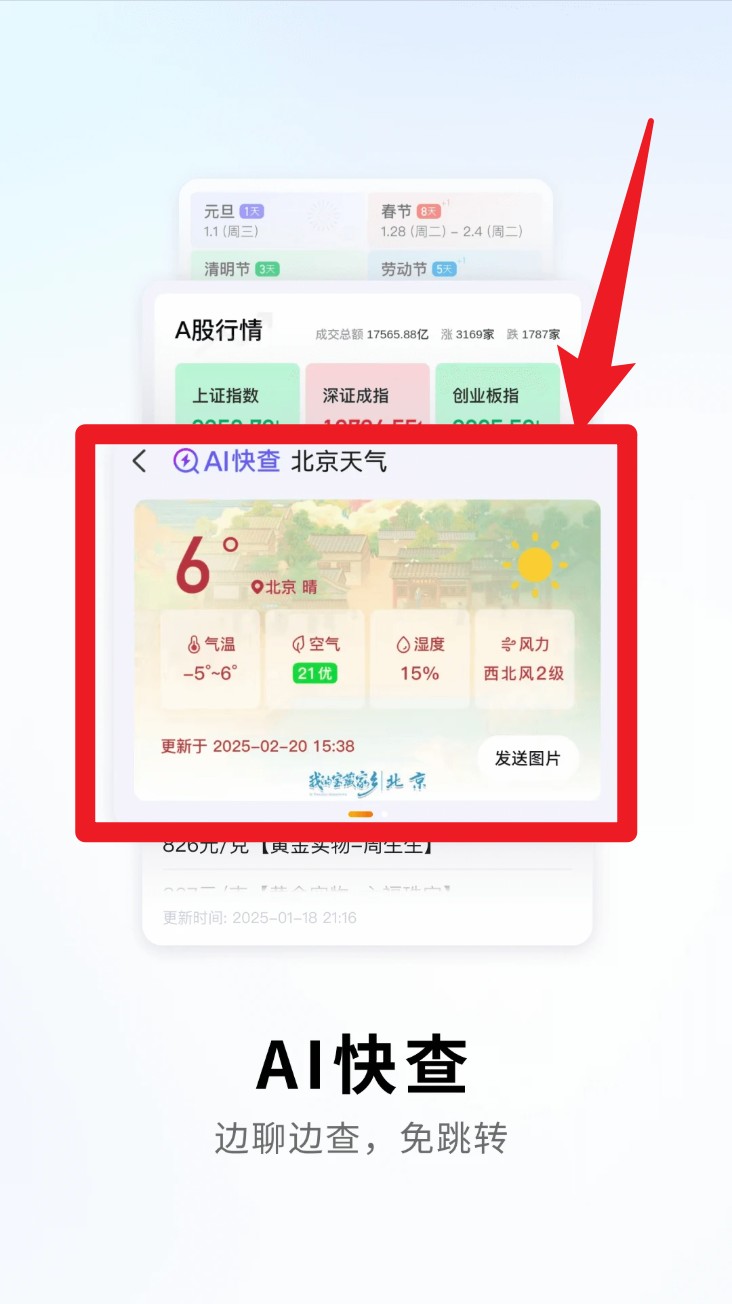 3. 输入天气、股市、节日等关键词后,系统会自动显示 AI 快查结果,例如天气预报、股市行情等内容一键展示,还能生成卡片图片分享。