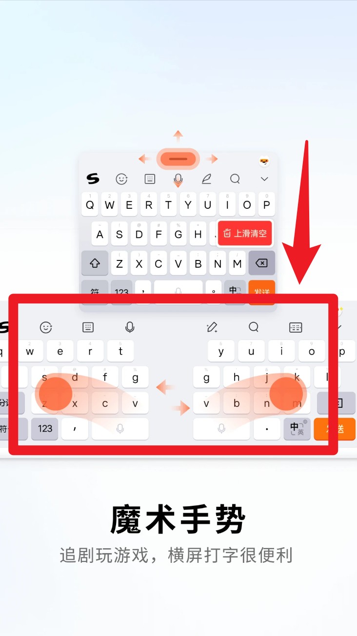 4. 横屏状态下启用“魔术手势”,双手拇指向内或向外滑动即可快速移动光标,轻松实现横屏打字与内容编辑,玩游戏时也不耽误聊天。