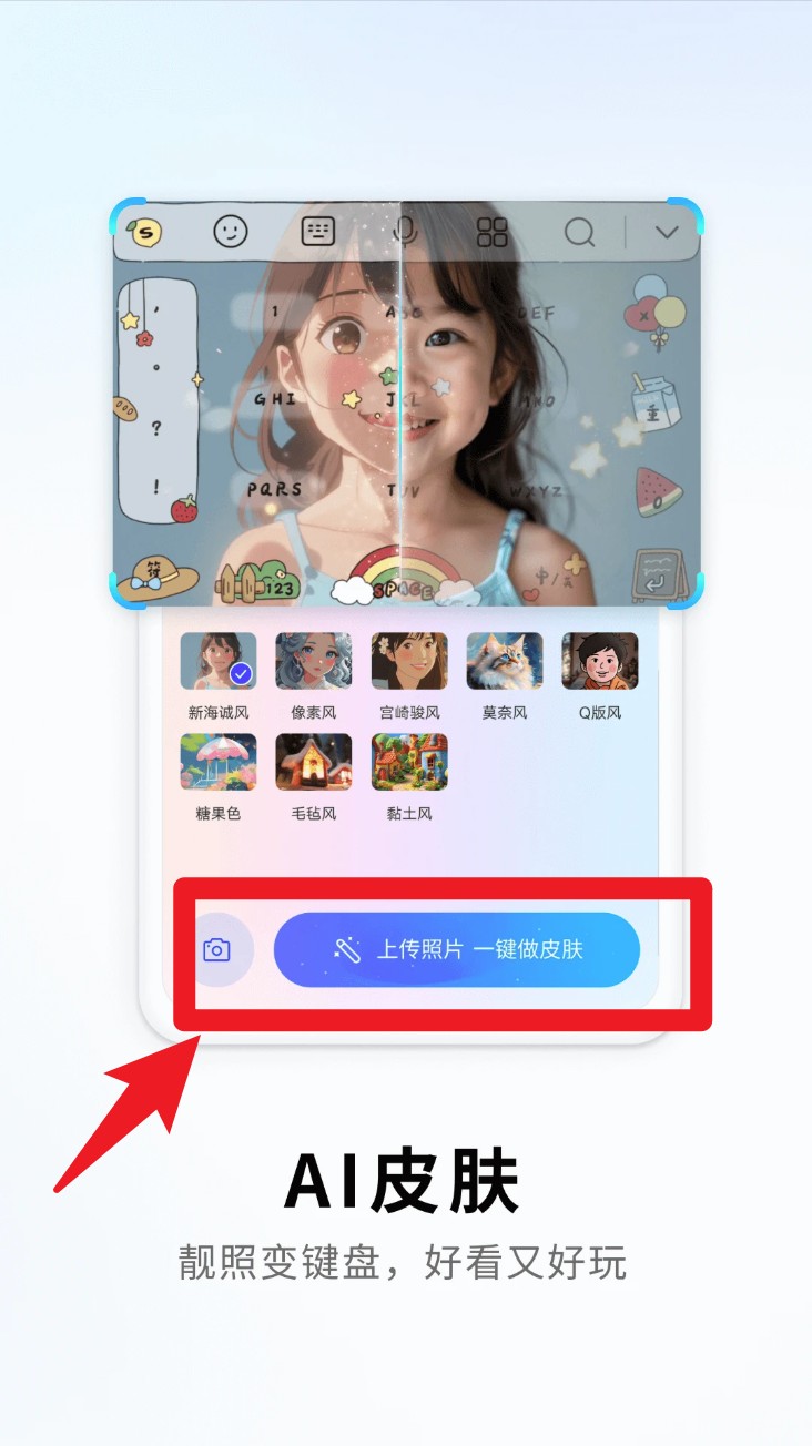 1. 打开输入法面板,点击“上传照片一键做皮肤”,系统会自动生成专属主题键盘,支持宫崎骏风、糖果色、像素风等多种风格,轻松打造个性外观。