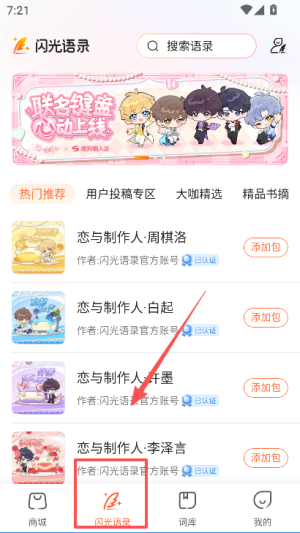 2、点击底部闪语语录标签,进入对应页面,浏览热门推荐的语录内容。
