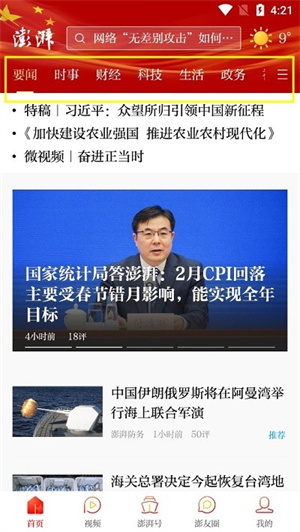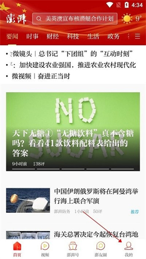 2、软件首页下方为用户提供了多种板块分类,包含了首页、视频、澎湃号、澎友圈、我的等几大板块。