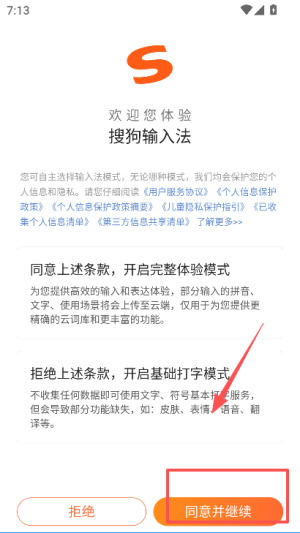 1、打开搜狗输入法,查看弹出的服务条款内容,点击同意并继续按钮开启完整体验模式。