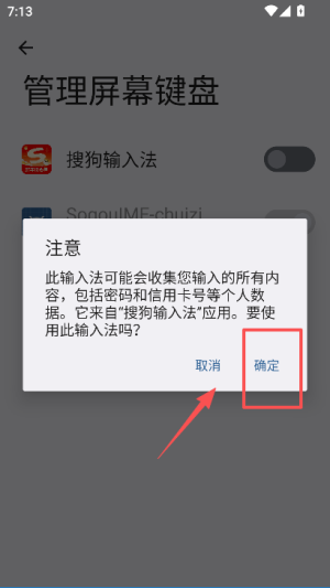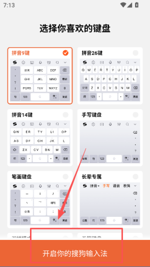 2、进入选择键盘页面,选定喜欢的键盘样式后,点击开启你的搜狗输入法按钮。