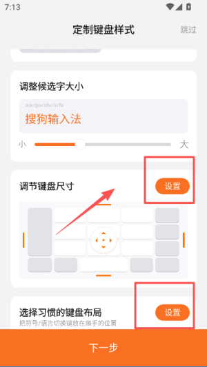 3、进入定制键盘样式页面,调整候选字大小与键盘尺寸,点击对应设置按钮完成配置。