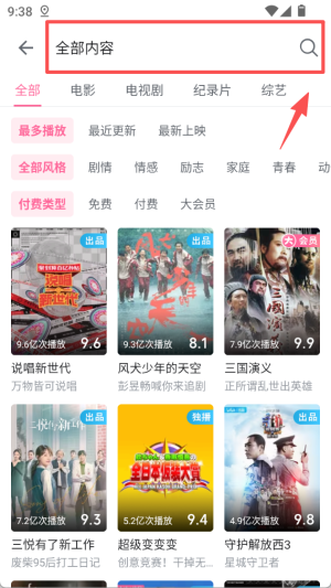 2、点击影视板块里的分类选项,进入 “全部内容” 页面,这里可按电影、电视剧等类别筛选,还能选择播放风格与观看权限。