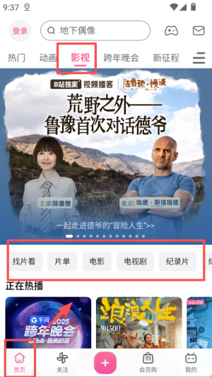 1、在应用首页,点击顶部 “影视” 标签,进入影视板块,页面有 “找片看”“片单” 等分类,下方展示正在热播的内容。