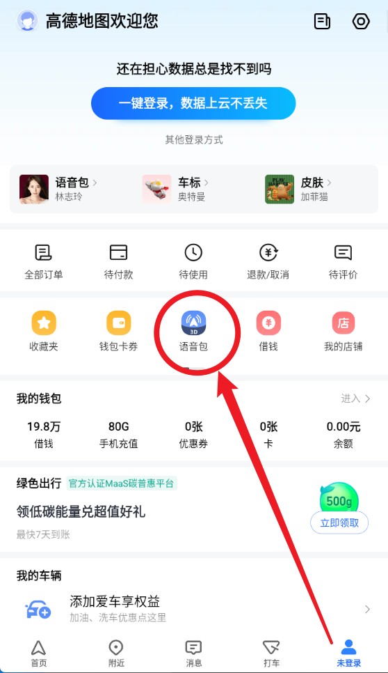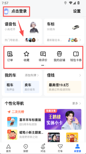 2、登录成功后进入个人页面,可看到订单、收藏等功能入口,还有语音包、车标等个性化设置选项。