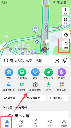 4、回到首页,点击右上角 “路线” 按钮,可进入路线规划页面,结合驾车、公交等方式规划出行路径。