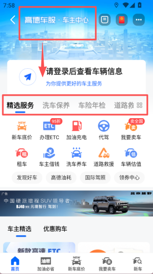 3、进入 “高德车服・车主中心”,页面提示需登录查看车辆信息,下方有洗车保养、车险年检等精选服务。