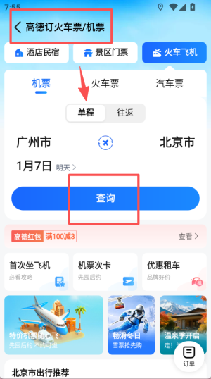 3、进入 “高铁订火车票机票” 页面,选择 “机票” 分类与 “单程” 类型,填好出发地、目的地后点击 “查询”。