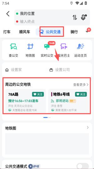 2、切换到 “公共交通” 分类,页面会展示周边的公交地铁线路,包括具体的公交班次与地铁线路信息。