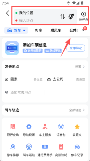 1、在首页点击 “驾车” 选项,进入后可选择起点为 “我的位置”,再输入终点,还能添加车辆信息绑定。