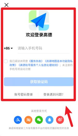 1、打开app,输入手机号码并点击“获取验证码”,完成验证后即可登录使用高德地图各项功能。
