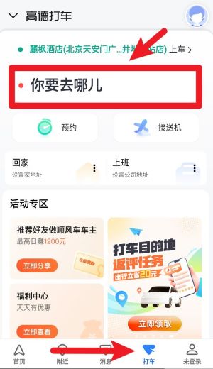 4、点击底部“打车”进入高德打车界面,输入目的地即可一键叫车,支持预约、接送机等多种出行场景。