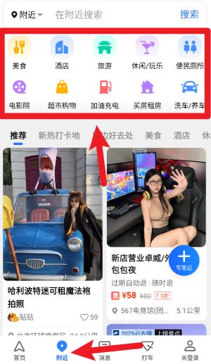 3、点击底部“附近”栏目,可快速搜索美食、酒店、加油站等生活服务地点,获取地图导航与优惠信息。