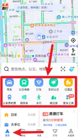 2、在首页点击“驾车、公交通勤、打车”等图标即可快速选择出行方式,支持实时导航与路线查询。