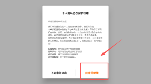 1、打开软件后,查看个人隐私协议保护政策内容,点击同意并继续按钮进入应用。