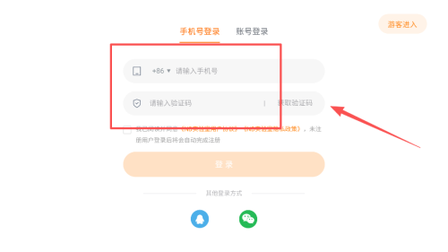 3、进入登录页面,选择手机号登录方式,填写手机号并获取验证码,准备完成登录。